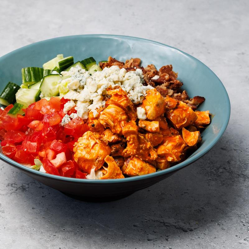 Mixed greens and romaine, bacon, gorgonzola cheese, cucumbers, tomatoes, and scallions with ranch dressing. Option of BBQ, Buffalo, or grilled chicken.