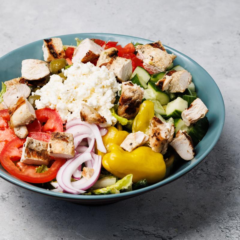 Mixed greens, red onions, greek olives, tomatoes, pepperoncini, cucumber, feta cheese with garlic lemon dressing.