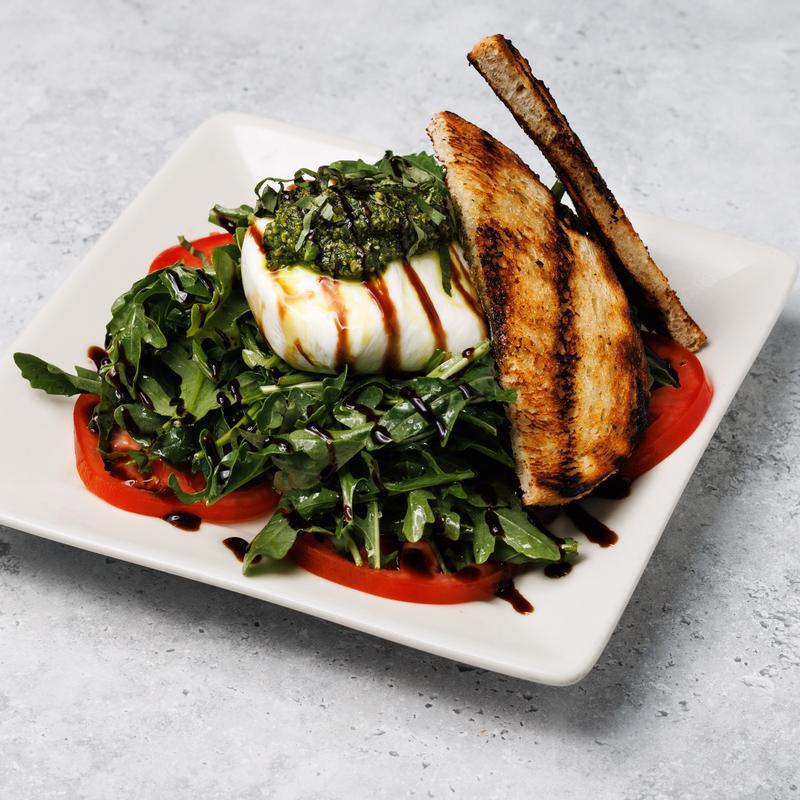 Freshly sliced tomatoes, Burrata cheese, arugula, fresh basil, pure olive oil and balsamic reduction. Served with garlic bread.