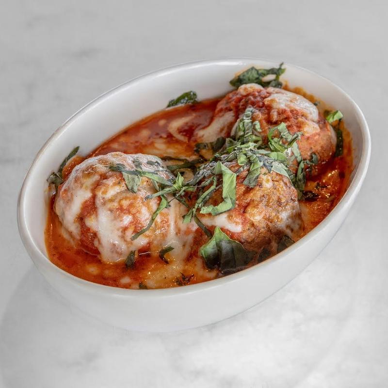 Meatballs baked in marinara sauce, with parmesan and mozzarella